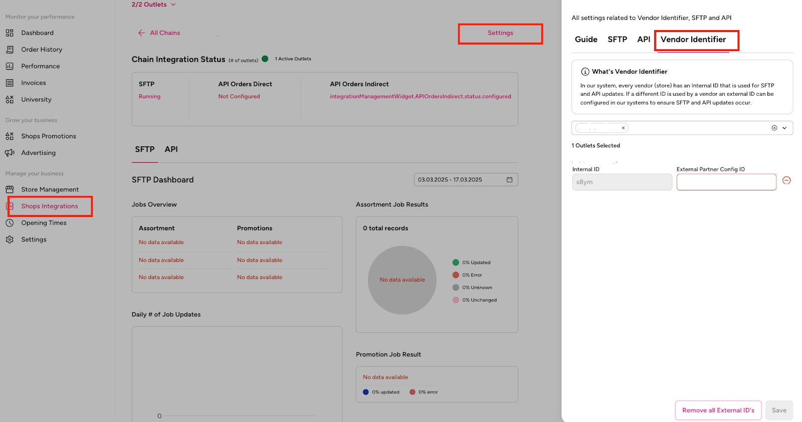 If you have your own Vendor IDs, you are welcome to use them. Simply map your IDs in the Partner Portal under the "Vendor Identifier" section, as shown in the screenshot below, and link your external Vendor ID to the Delivery Hero Vendor ID.